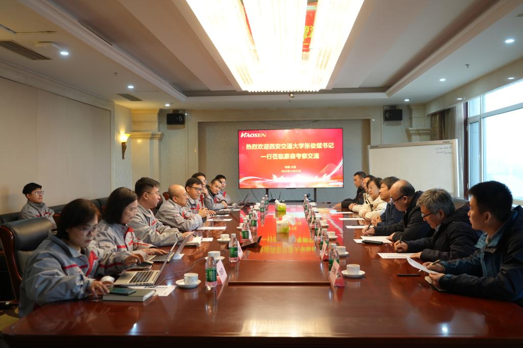 为深入贯彻落实学校“6352”工程和“1121”企业主导产学研深度融合新模式,深化校企协同创新机制,精准对接产业发展需求,凝聚校友力量,12月23日,西安交大机械学院党委书记张俊斌带队赴大连豪森智能装备股份有限公司开展调研交流活动。学院党委副书记张敏、副院长周光辉、党委委员丁建军、院办主任张新功等参加调研。豪森集团常务副总裁赵方灏、人力行政部总监孙洪鹏、智能研究院院长黎炯、院长特助孙洪涛、科技发展高级经理李佳萍等企业负责人及校友代表祝冬明、潘培参加座谈。