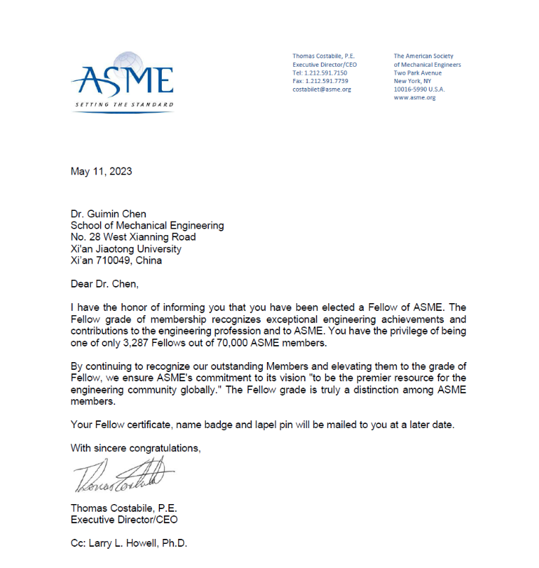 西安交大机械工程学院陈贵敏教授入选ASME Fellow