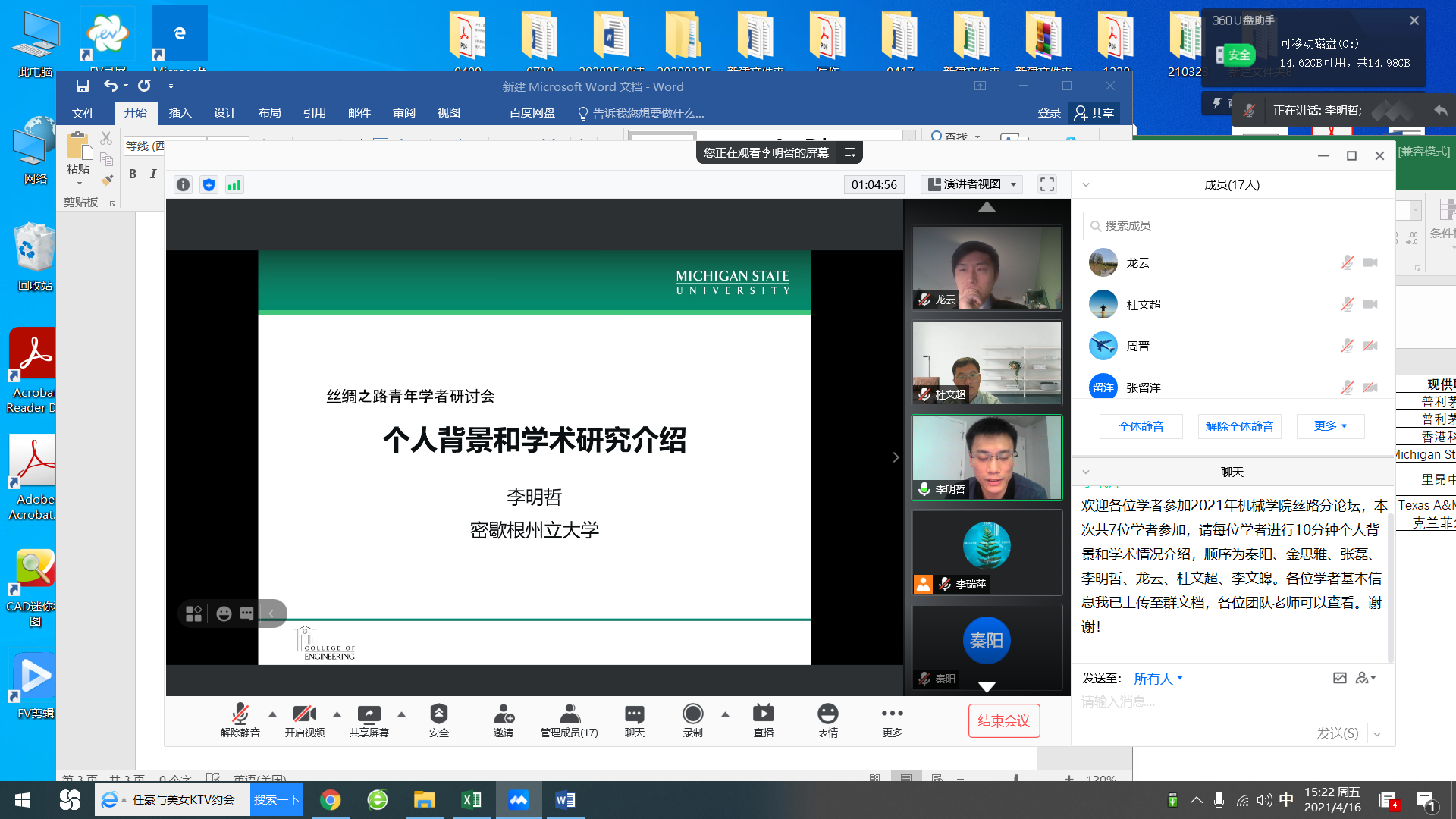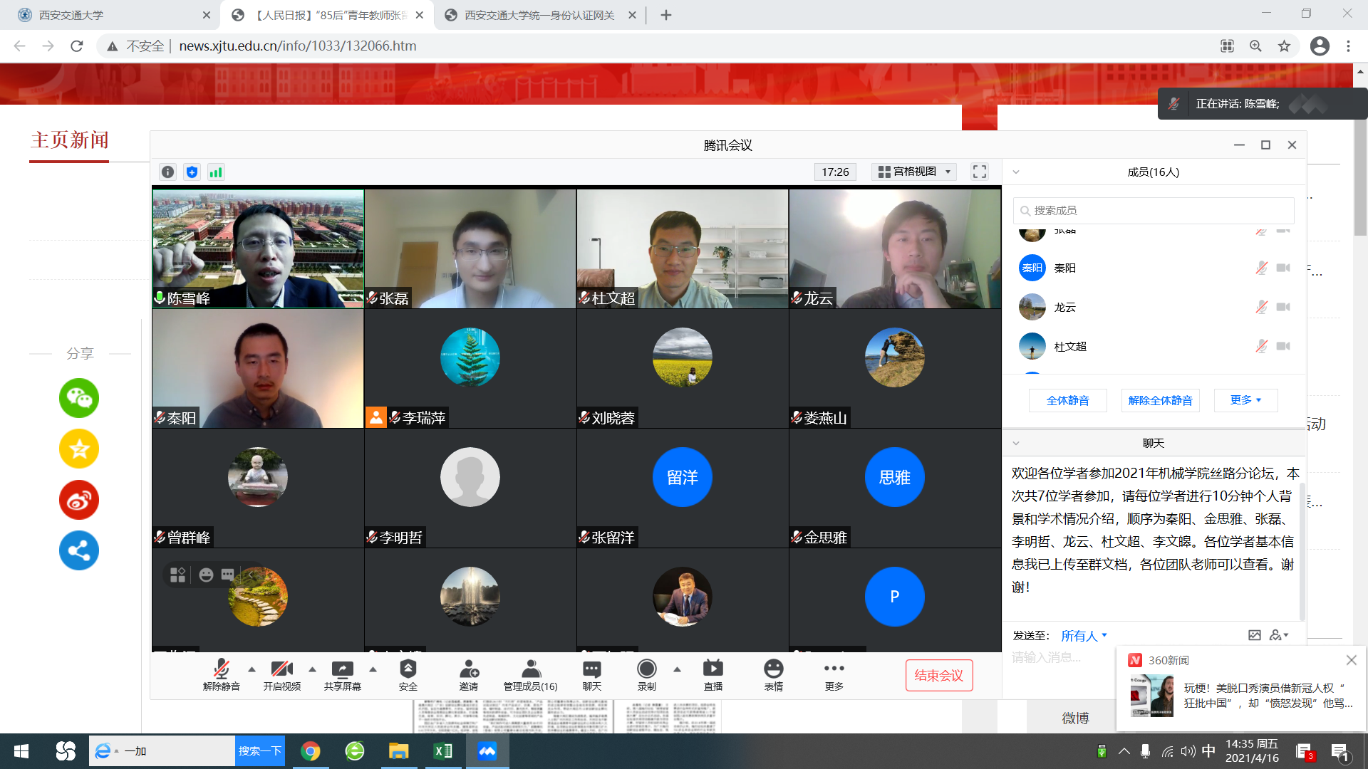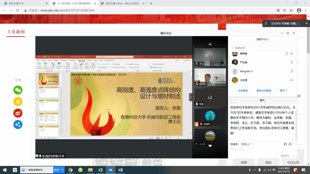 4月16日下午,第七届“丝绸之路青年学者研讨会”机械分论坛以线上方式召开。来自海内外不同国家的青年学者、学院青年人才及各相关领域的团队负责人通过网络会议“见面”、交流。机械工程学院院长陈雪峰教授主持会议。