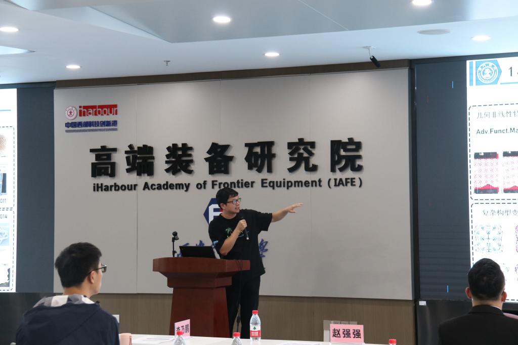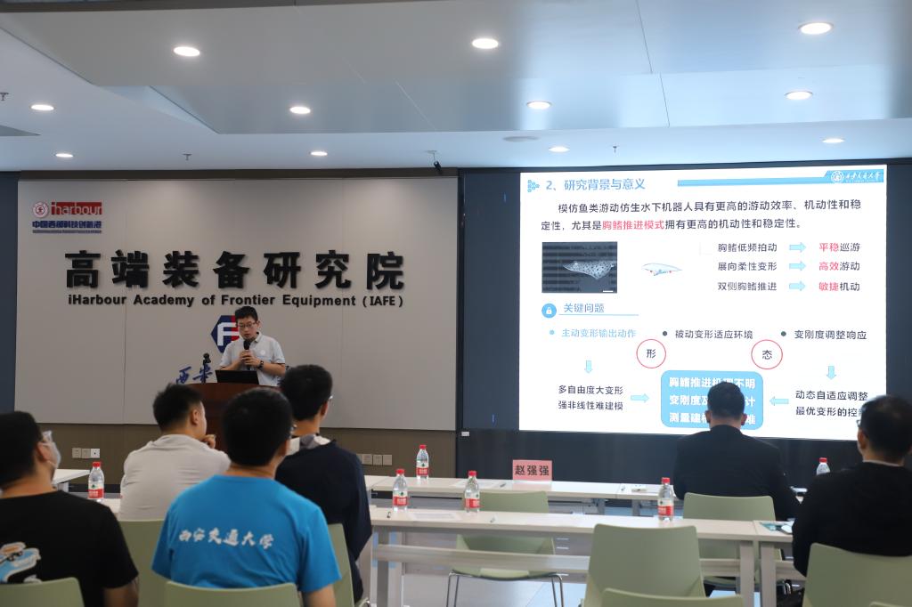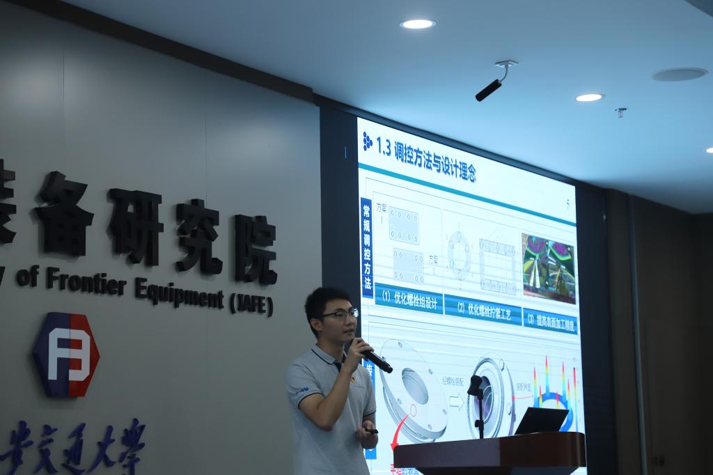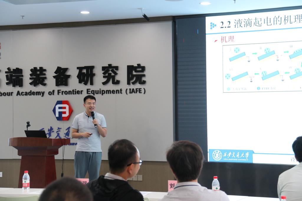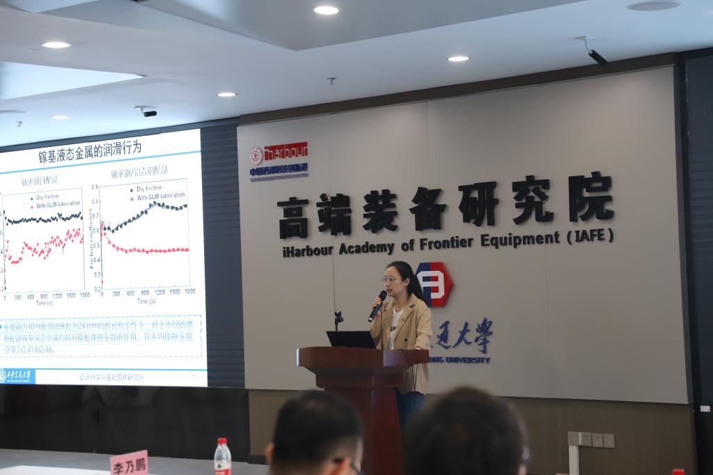之后,博士研究生乔煜庭、尹鹏、王岗、成海炎、李星、陈飞、禹健、程磊分别做了“工业机器人振动模态测试方法”、“点阵力学超材料非均匀配置设计及性能研究”、“基于声学超材料的主轴系统振动抑制研究”、“软体仿生机器鱼主动变形姿态控制方法研究”、“镓基液态金属的润滑增效研究”、“轴承材料性能预测方法研究”、“固-液两相流体耦合起电原理及应用研究”、“基于纳米移液探针成像关键技术的研究”等八个报告,现场老师同学也畅所欲言、相互启迪,形成了无拘无束、发散思维的“沙龙”氛围。