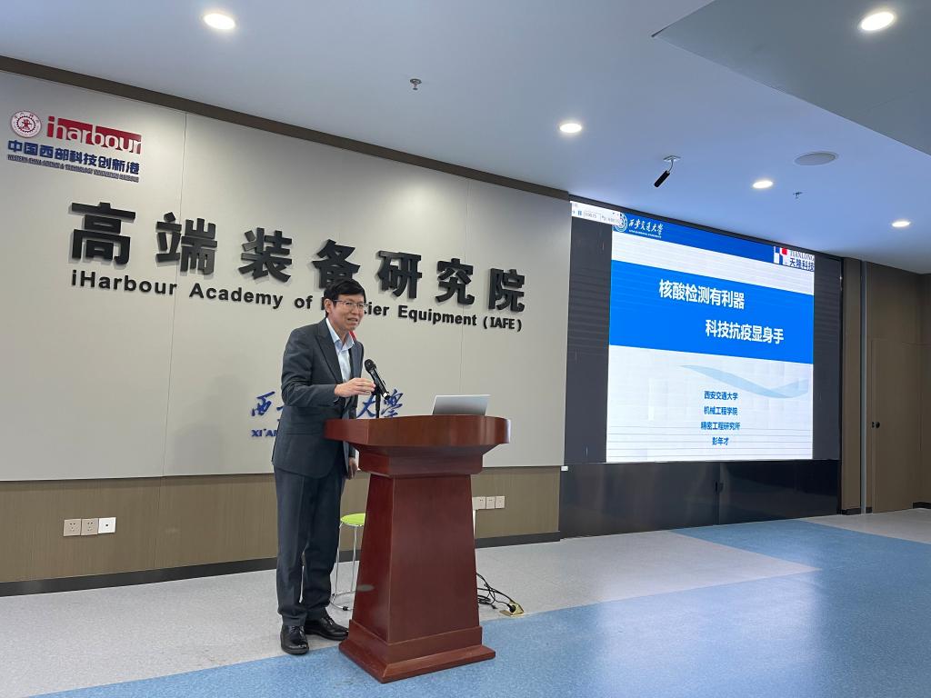 面向人民生命健康,彭年才教授作题为《核酸检测有利器,科技抗疫显身手》的报告。彭年才指出,核酸检测需要一个严密的系统,不仅需要高灵敏的检测试剂,更需要高端的核酸检测设备,试剂盒和检测仪缺一不可。疫情关键时期,彭年才带领的科研团队突破了高端核酸检测仪器系列“卡脖子”技术难题,解决了核酸提取易交叉污染、快速热循环基因扩增温度均匀性差、集成式MEMS生物传感以及多靶标核酸检测等系列技术难题,发明高通量多靶标核酸自动化定量检测技术并成功产业化系列核酸提取检测产品,形成了一体化的高通量多靶标核酸自动化定量检测系统解决方案和产品组合,助力疫情防控。彭年才表示,将进一步研发将向着更自动化、更人性化、更智能化的方向发展。