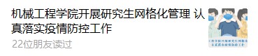 2.网格化管理有序进行,党团支部骨干显担当。“今日填报完成率99.9%,各位网格员辛苦了!”为进一步严格落实各项防控措施,把每项工作、每个环节做实做细做到位,机械学院通过党、团支部构建“学院党委副书记-辅导员-兼职辅导员/党建办成员-党支书/团支书-网格员-被联系人”的疫情期间网格化管理体系,通过扁平的网格化管理,完成了从学院党委副书记、辅导员到机械学院2000余名研究生的精准对接,保障实时将学校、学院各项重要通知和信息传递给学院的每一位研究生。