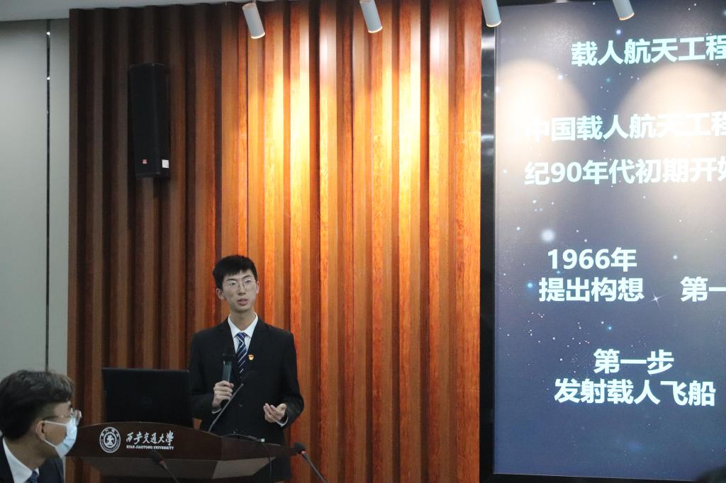 西安交通大学学生微宣讲团毛新宇在论坛上进行了“弘扬载人航天精神,逐梦星辰大海”的主题分享。介绍了中国载人航天工程的“三步走”发展战略,并鼓励大家积极弘扬载人航天精神,要“特别能吃苦、特别能战斗、特别能攻关、特别能奉献”。