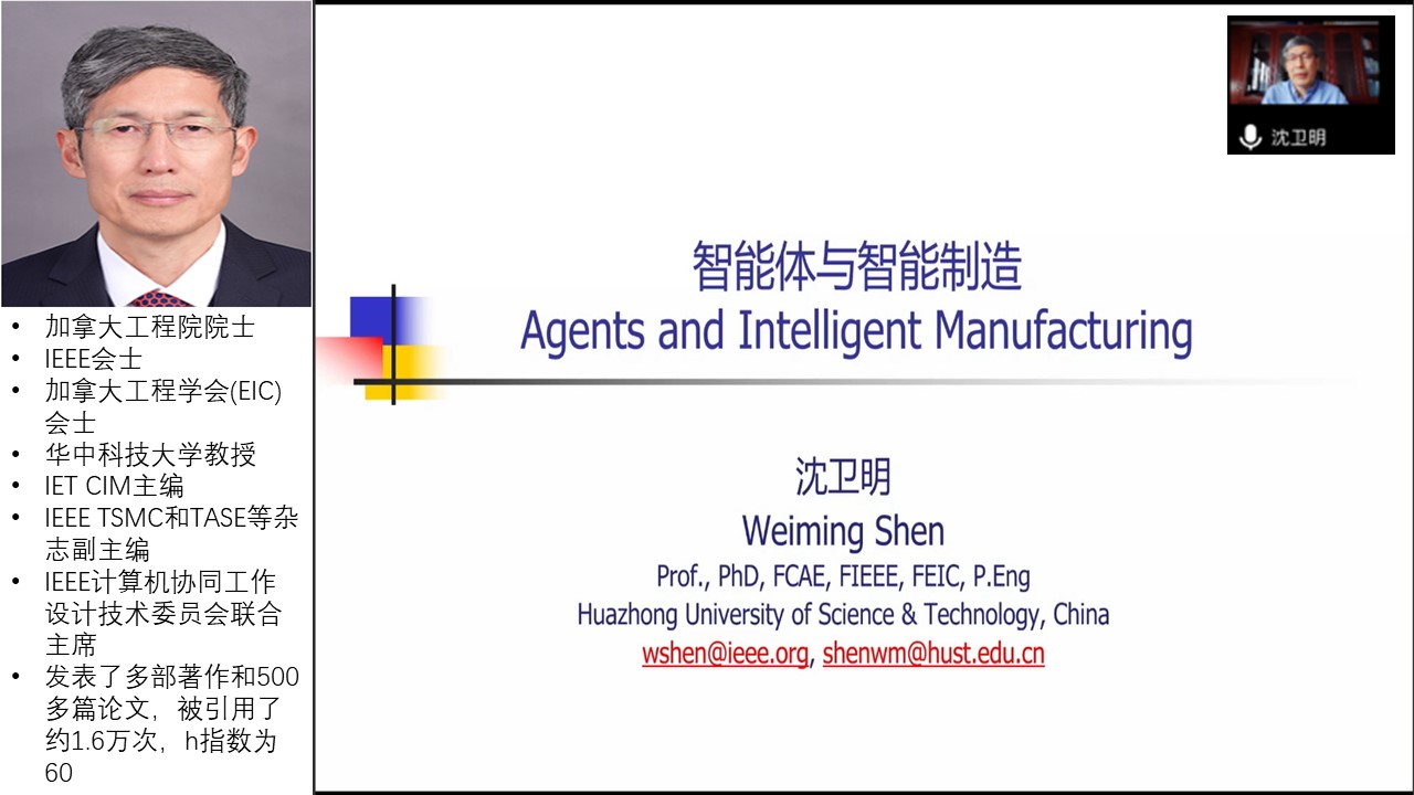 Weiming Shen教授做了题为“Agents and Intelligent Manufacturing”学术报告,所开发的智能体技术为分布式智能制造和工业自动化系统开发提供了一种新的范式,分享了智能体协同设计与制造技术与系统的开发经验,并针对智能体技术未来的发展趋势、研发机遇与挑战给了宝贵的建议。