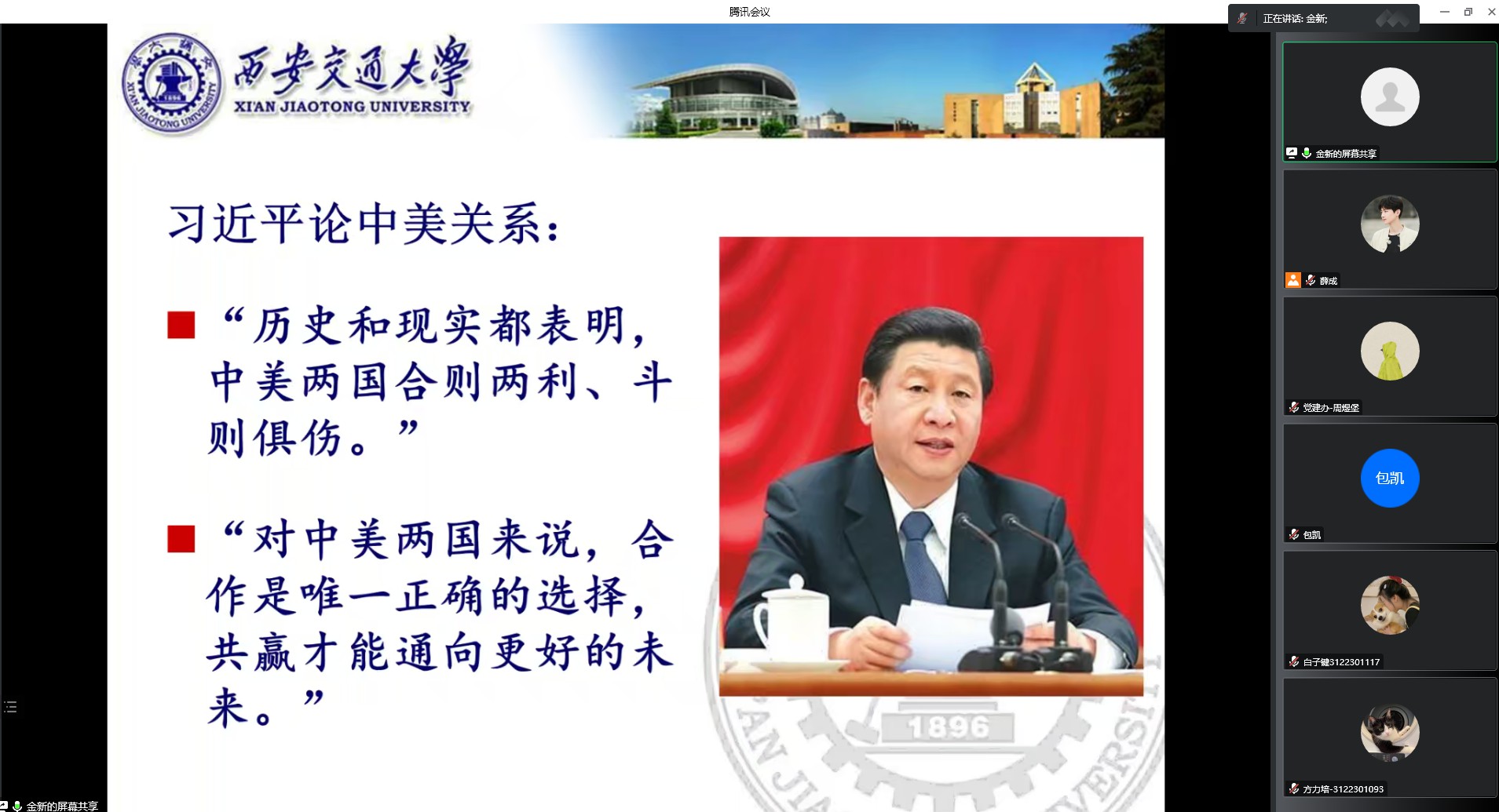 金新结合党的二十大报告,从百年未有之大变局、冷战后国际格局的基本特征、大变局中国际格局的演化趋势、大变局下中美关系的发展趋势、中美主要矛盾与美国对华战略、“修昔底德陷阱”的中国对策等方面系统梳理了百年变局下的中美关系,系统阐述了我国全面推进中国特色大国外交的立场、战略部署等。金新勉励同学们要有主人翁意识,以高度的责任感在中华民族伟大复兴的进程中奋勇拼搏。