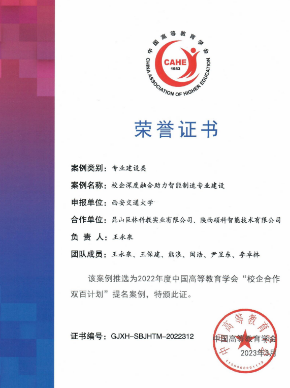 我院入选案例以数字孪生智能制造实践教学平台建设为主线,发挥机械工程学院与昆山巨林科教有限公司、陕西硕科智能技术有限公司、西安吉利汽车等各方优势,打破知识壁垒,促进产教融合,依托平台开发高阶性教学项目,开发示范性案例与教材,建成资源融合充分、结构体系完整、学科特色鲜明的实践教学体系,支撑传统专业转型升级和智能制造工程专业建设,推动和引领了新型工程科技人才培养理念及模式改革。