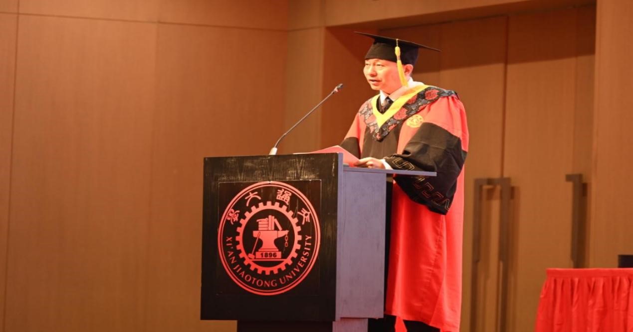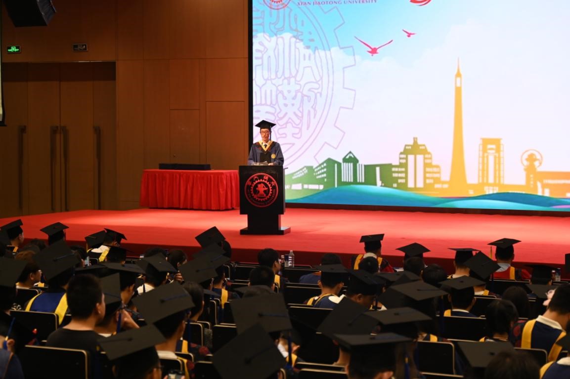 机械工程学院党委书记王朝晖教授为毕业生送上了毕业寄语。王朝晖教授回顾了同学们在交大的求学时光,对同学们的毕业表示祝贺,希望大家鹏程万里、前程似锦。希望同学们带着交大人的光荣与梦想,在时代洪流中抓住机遇,用更深刻的眼光审视自己,以更大的胸怀迎接挑战,继续传承好西迁精神,敢担当、勇作为,做新时代的奋进者,不懈攀登、永不退缩!