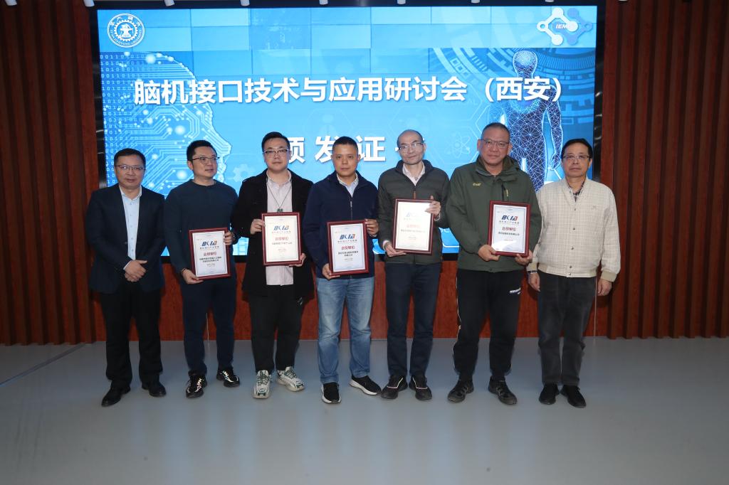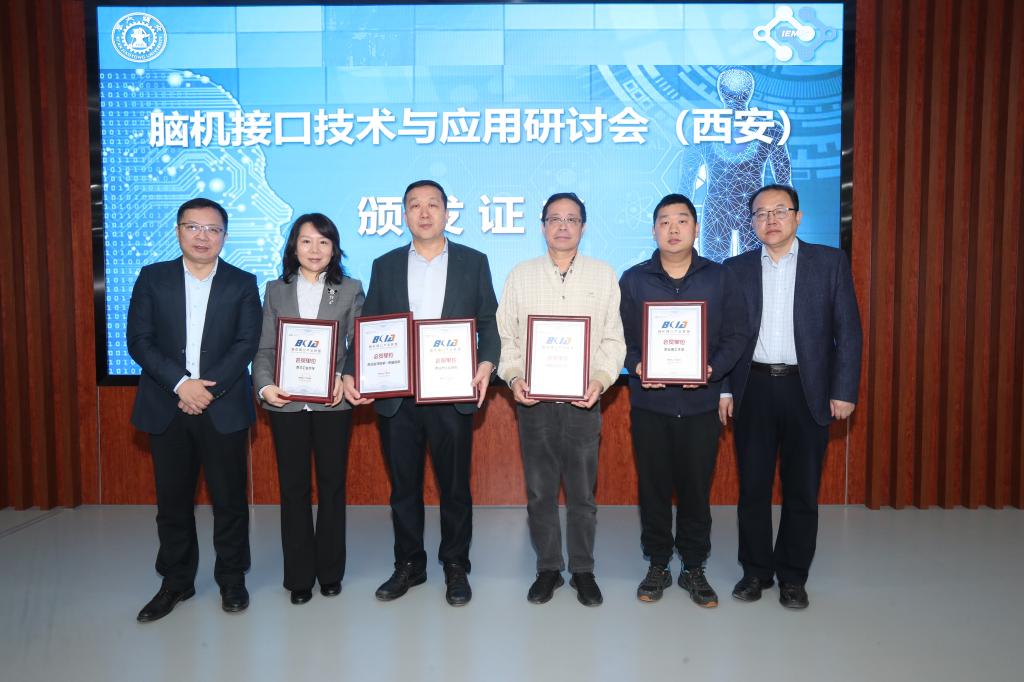 脑机接口产业联盟副秘书长张倩介绍了脑机接口产业联盟的工作,李文宇秘书长、西安交通大学徐光华教授、西北大学医学院赵钢院长共同为会员单位颁发证书。