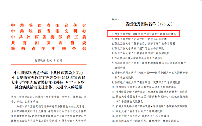 近日,中共陕西省委宣传部、中共陕西省委文明办、中共陕西省委教育工委、团陕西省委等印发了《关于2023年陕西省大中专学生志愿者暑期文化科技卫生“三下乡”社会实践活动先进集体、 先进个人的通报》。由学校对口支援办公室、党委研工部、党委学工部、校团委支持指导,机械工程学院具体实施的“西安交通大学-新疆大学‘同心筑梦’联合实践团队”获评陕西省优秀团队。实践团队指导老师为张敏、包凯、苏宇、马勇。