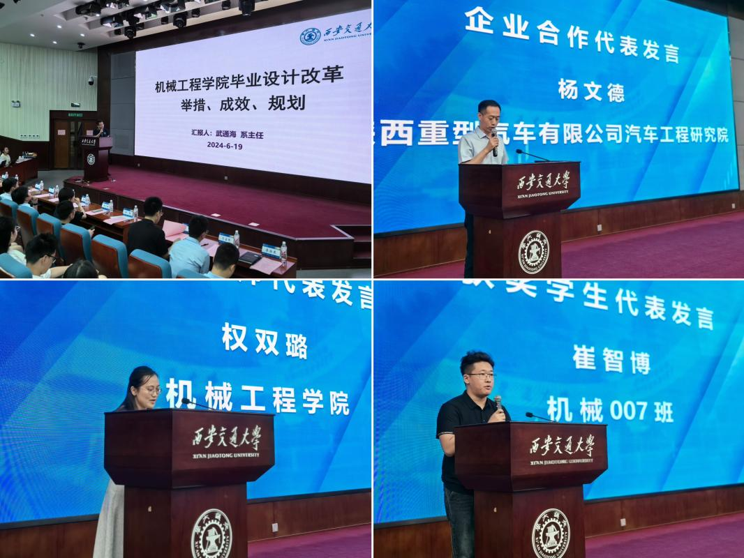 机械工程系系主任武通海教授作2024届本科毕业设计情况的报告,他从毕业设计改革举措、成效以及未来规划三个方面阐述了学院在毕业设计环节的创新与实践过程。指导教师代表权双璐,企业导师代表陕汽工程研究院研发支持部部长杨文德、获奖学生代表机械007班学生崔智博分别作交流发言,分享了指导或参与毕业设计的经验与心得。