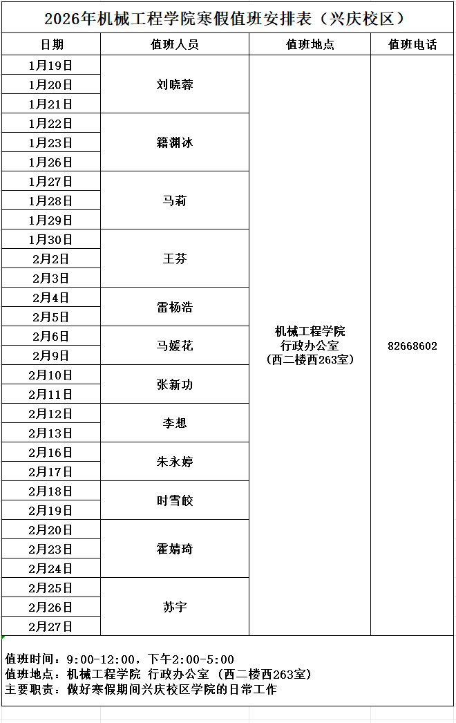 值班时间及值班人员信息详见寒假值班表。