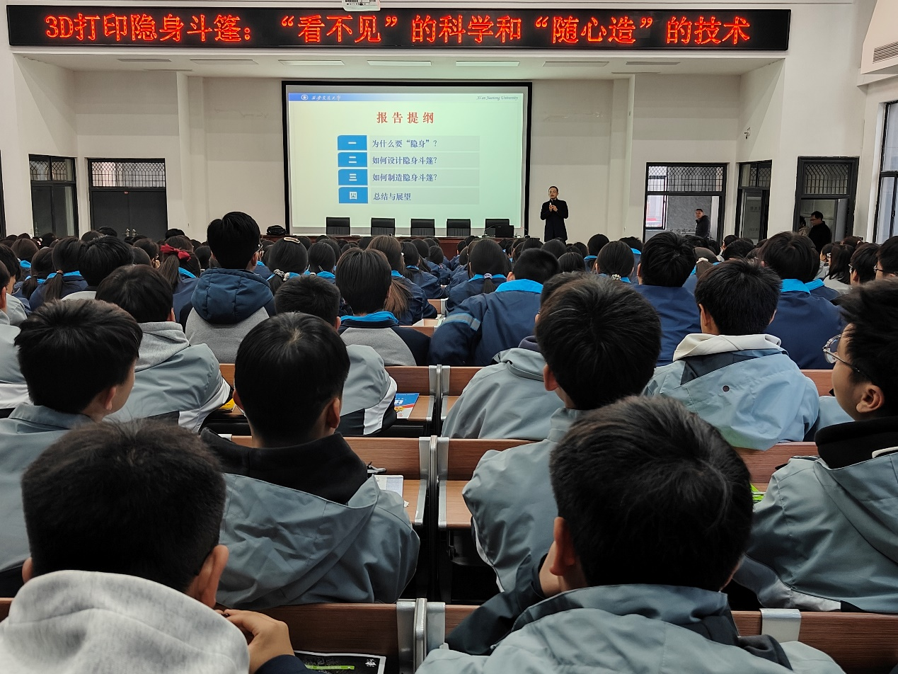 梁庆宣教授以《3D打印隐身斗篷:“看不见”的科学和“随心造”的技术》为题开展讲座。作为深耕功能结构3D打印技术的专家,他主持过国家自然科学基金、国防项目等多项课题,发表SCI论文50余篇,研究成果获国际权威媒体报道。讲座中,他用通俗语言拆解复杂原理,从“隐身需求溯源”“斗篷设计原理”“制造技术拆解”到“领域未来展望”,层层递进地阐释了超材料与3D打印技术的深度融合——超材料通过微结构设计调控电磁波,3D打印则实现复杂结构精准成型,让听众读懂“看不见”的科学奥秘与“随心造”的技术力量。